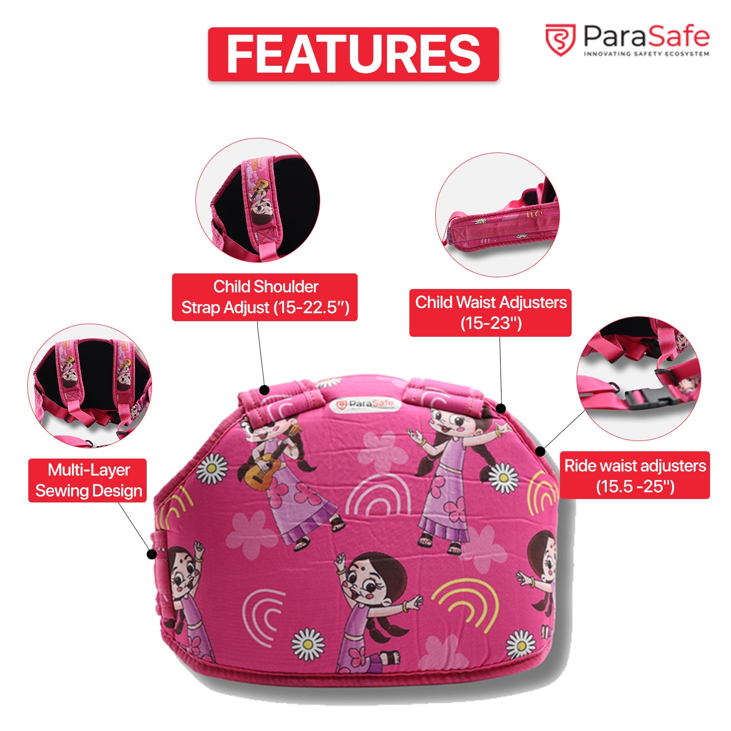 Designed to fit motorcycles, scooters, scooty, and bikes of all models. The adjustable waist belt fits adults of all sizes, making it suitable for any parent or guardian.